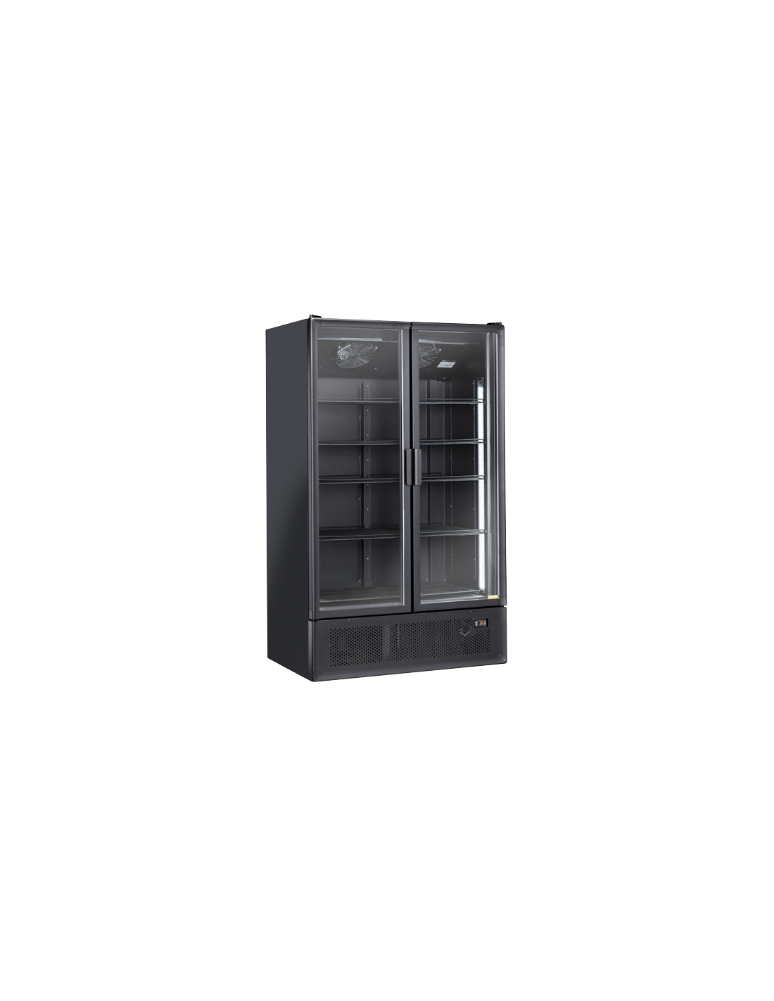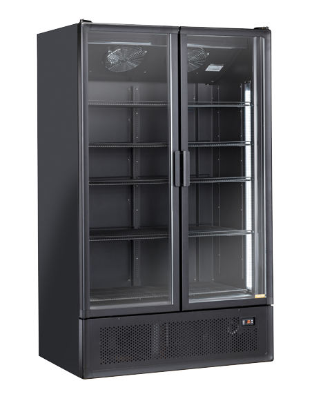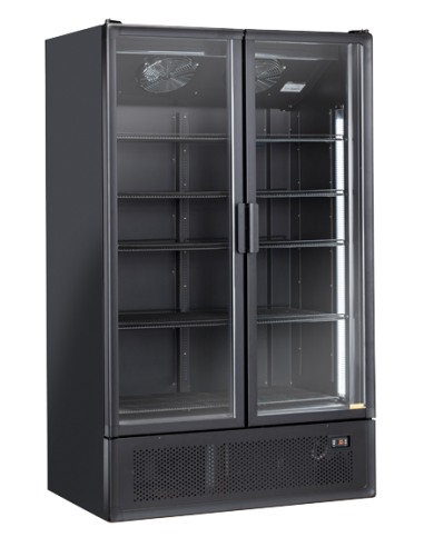 Armadio refrigerato con porta in vetro, con una capacità di 1200Lt, tempratura positiva +2°+10°C , colore nero e con maniglia esterna quadrata in alluminio, questo prodotto è equipaggiato con luce LED verticale interna con interruttore indipendente, serratura, display digitale, 4 ripiani regolabili, porta autochiudente e doppio vetro temperato di sicurezza.